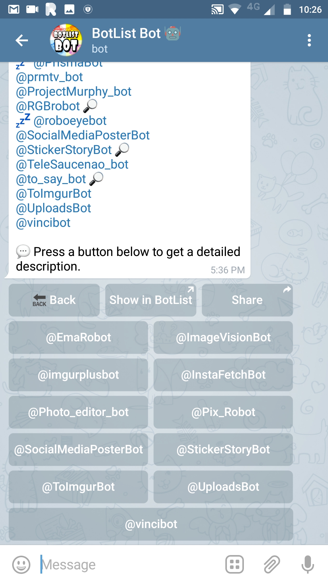 @botlistbot – This bot is maintained by an active Telegram community. It shows you a collection of many useful bots for various purposes. You can search bots category-wise. You could also suggest new bots to be added to its database.